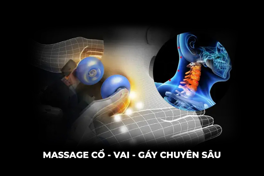 Thiết lập sẵn bài massage cổ - vai - gáy với con lăn 4D di chuyển trên khung SL con lăn chạy từ đầu xuống cổ và sang 2 bên bả vai giúp chạm và ấn sâu vào từng huyệt đạo. Kết hợp với liệu pháp massage kéo giãn kiểu Thái, con lăn đẩy cột sống lên cao so với lưng ghế 13-14cm giúp thư giãn các đốt sống lưng, kéo căng các đốt sống cổ và cân chỉnh định hình cột sống và xương cổ.
