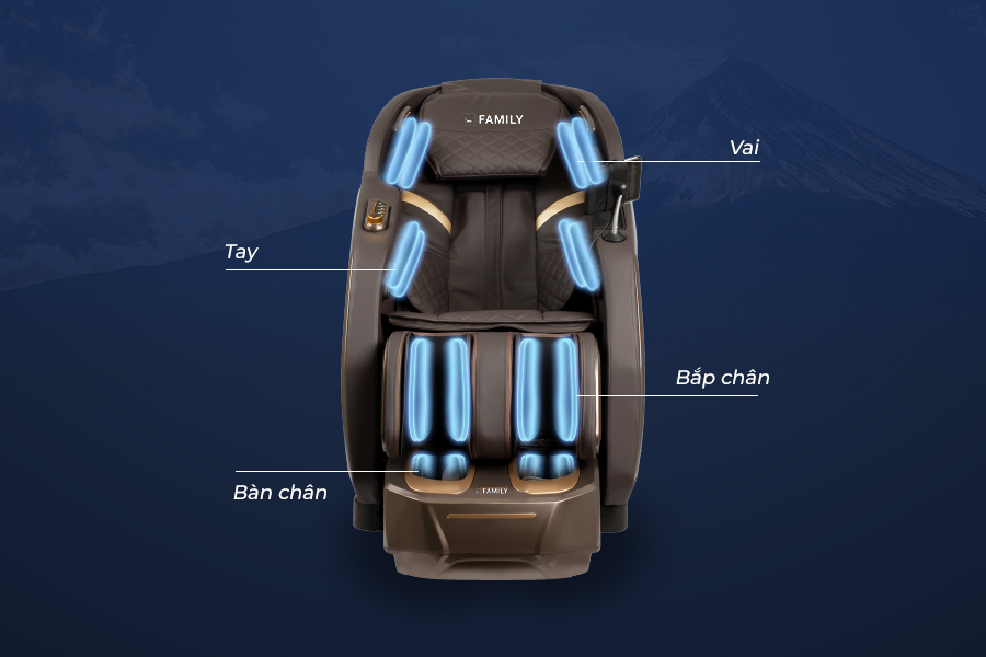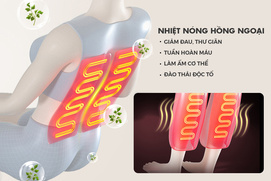 Kết hợp với hệ thống túi khí toàn thân xoa bóp làm thúc đẩy tính đàn hồi các cơ, thư giãn các vùng cơ đang bị nhức mỏi, đồng thời lưu thông khí huyết toàn thân và cung cấp sự thư thái cho cơ thể. Đặc biệt, khi áp dụng nhiệt sưởi ấm lên lưng và chân đúng cách, chúng còn giúp giảm căng thẳng, xoa dịu mệt mỏi và tăng cường sự thư thái, tạo cảm giác bình yên cho người sử dụng.