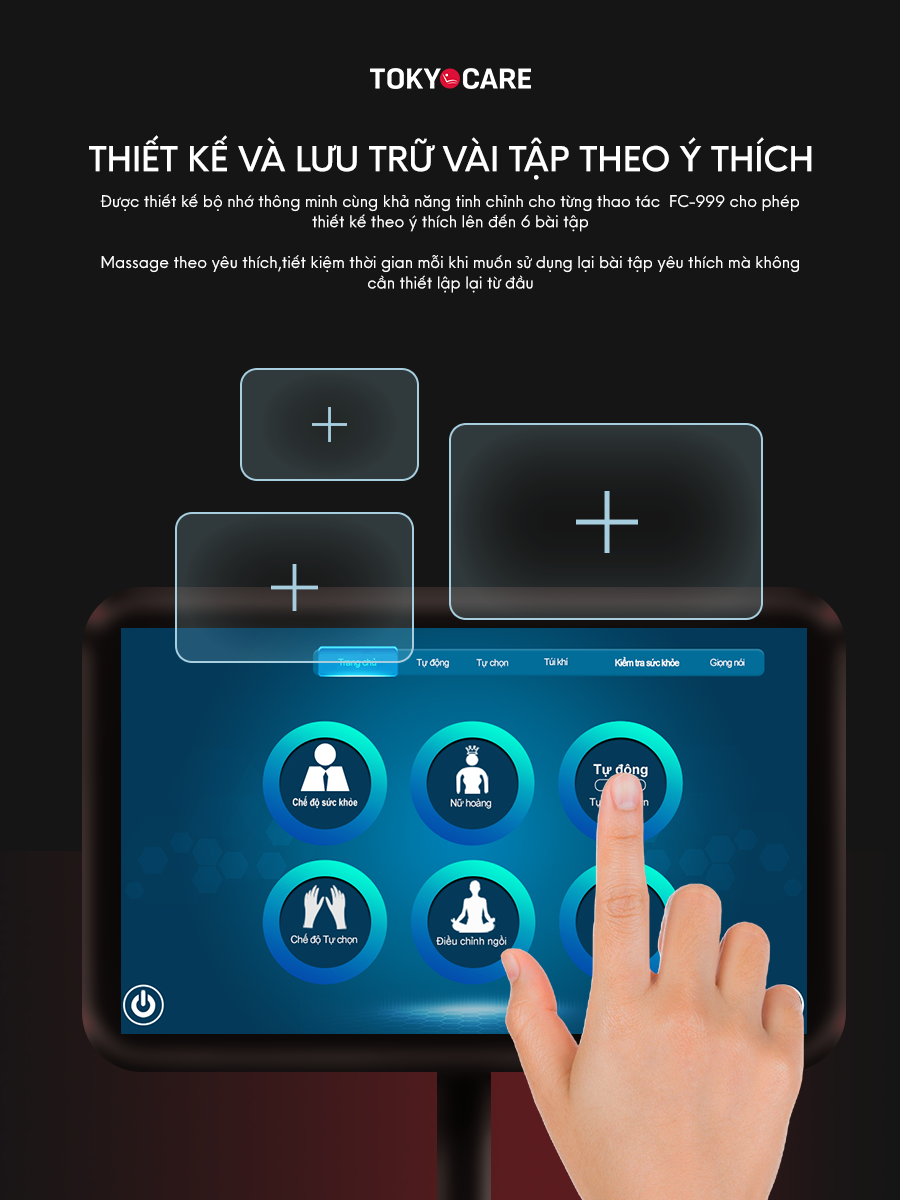 * Đa dạng bài tập: Tích hợp 24 bài tập tự động massage toàn thân, lưu trữ tới 6 bài tập cá nhân, mang đến trải nghiệm tùy chỉnh cao chỉ có ở những sản phẩm cao cấp được nghiên cứu và phát triển kinh nghiệm lâu năm.