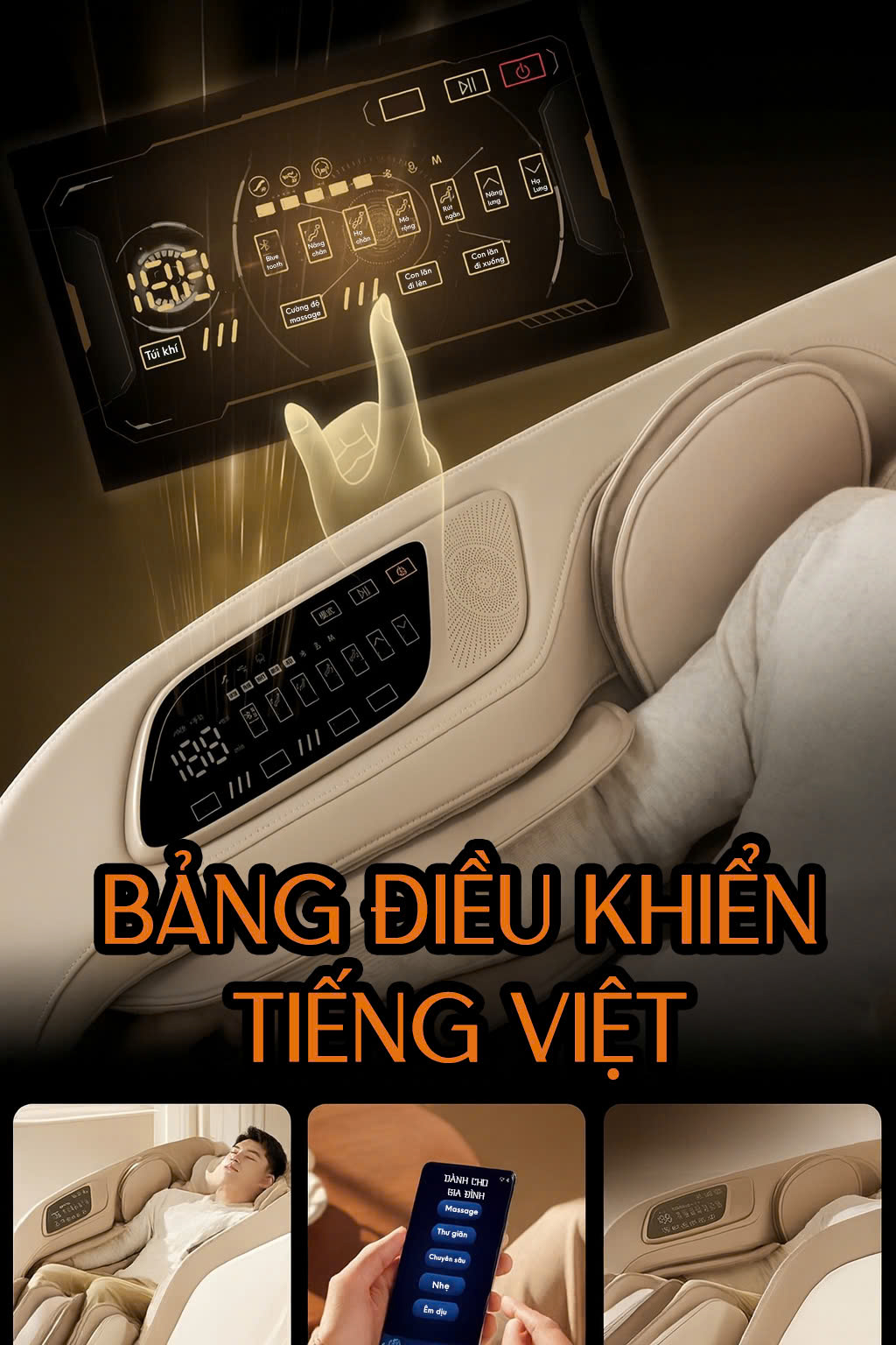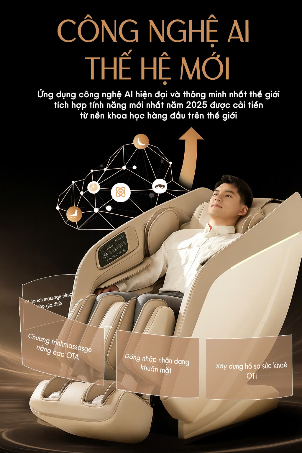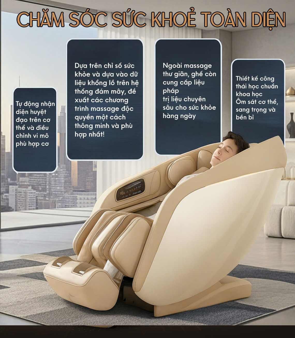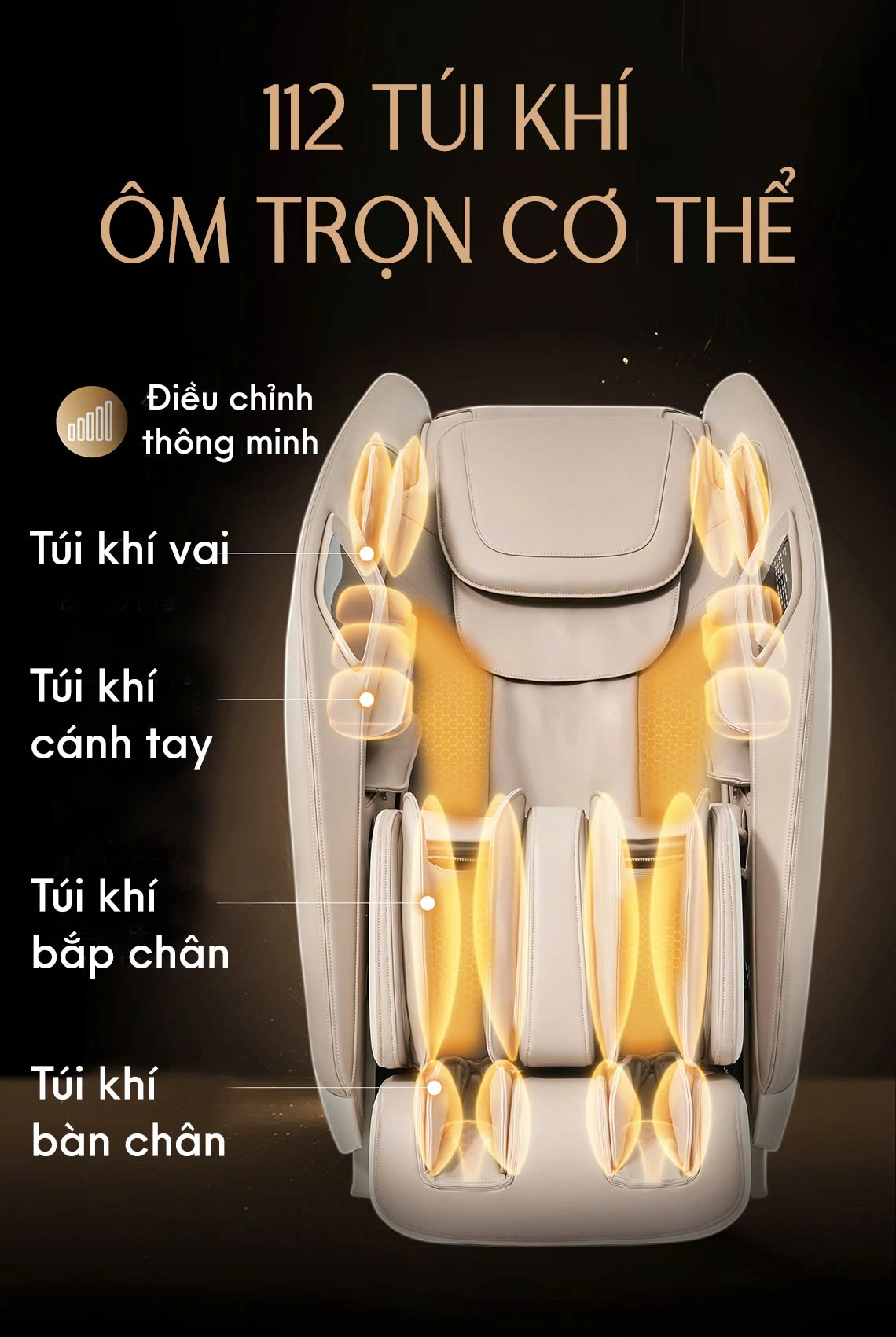 Hệ thống túi khí toàn thân – phân bổ khắp vai, tay, eo, bắp chân và bàn chân, ôm trọn cơ thể như vòng tay êm ái, xua tan mọi căng thẳng sau ngày dài mệt mỏi.