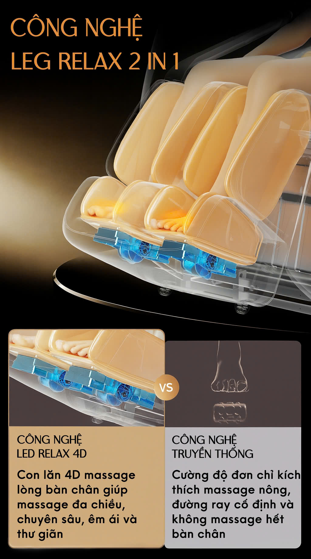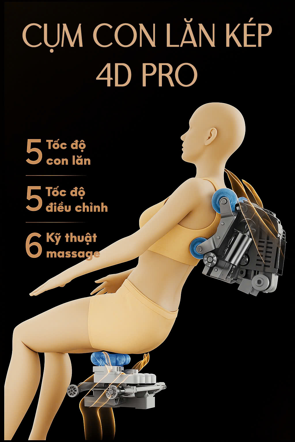 Sở hữu cụm con lăn kép 4D Pro – đỉnh cao công nghệ, massage đa chiều, mô phỏng chuẩn xác từng động tác tay của chuyên gia, len lỏi sâu đến từng bó cơ, giải phóng mọi căng thẳng.