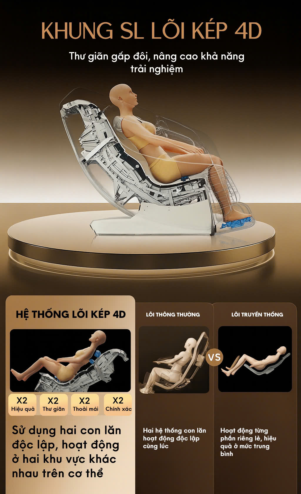 Hệ thống lõi kép hiệu suất cao thế hệ mới – đột phá trong công nghệ massage, cho phép trị liệu đa điểm đồng thời, rút ngắn thời gian nâng cao hiệu quả, mang lại trải nghiệm thư giãn toàn diện chưa từng có.