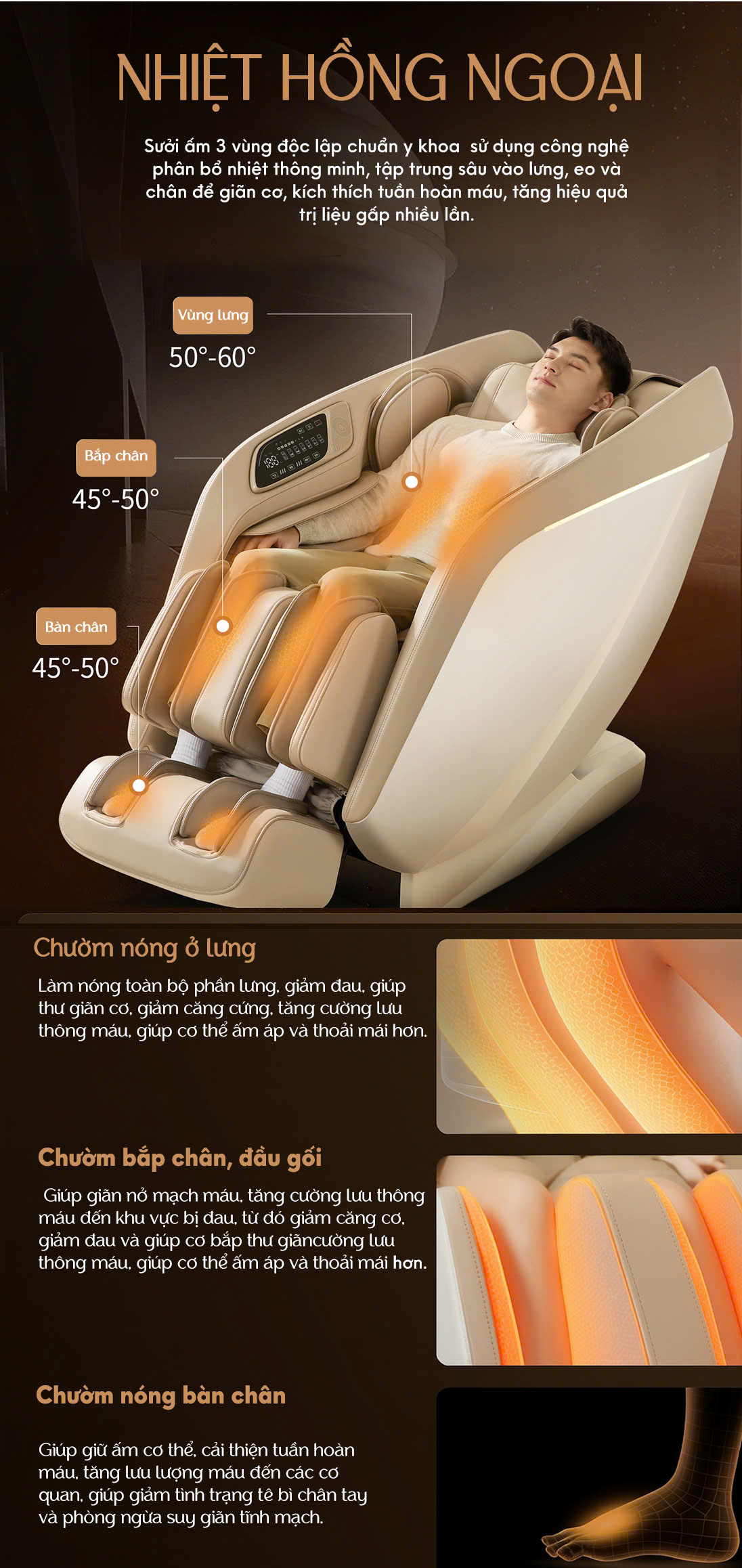 Zero Gravity với 3 cấp độ ngả ghế – ứng dụng nguyên lý phân bổ trọng lực của NASA, giúp giảm áp lực lên cột sống, cải thiện tuần hoàn máu và tối ưu hiệu quả của từng liệu trình massage.