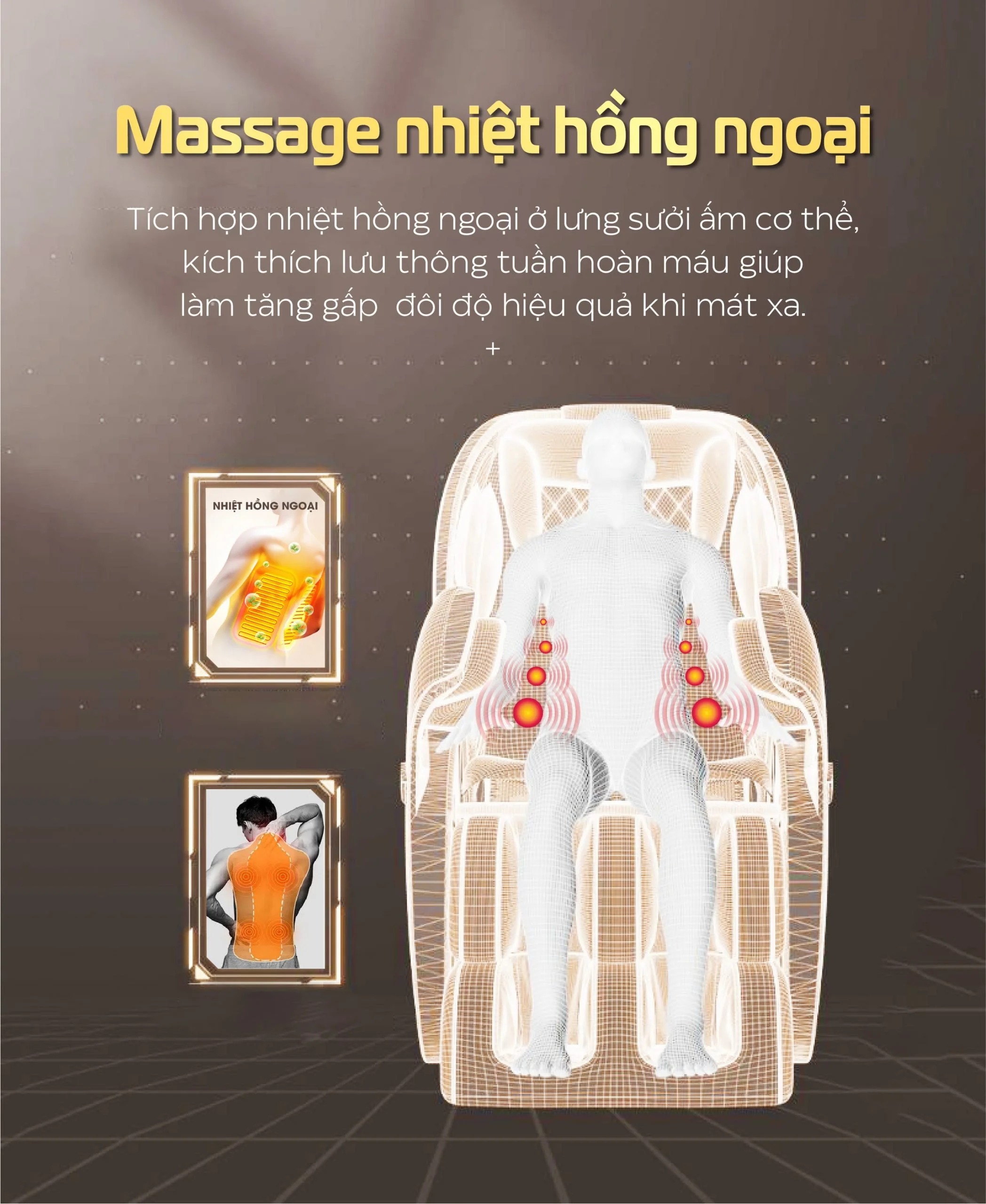 Chế độ nhiệt hồng ngoại duy trì ở mức 45-50°C, giúp ủ ấm cơ thể, kích thích tuần hoàn máu, thư giãn mạch máu và giảm căng cứng các nhóm cơ. Hỗ trợ giảm đau nhức xương khớp, phù hợp cho người cao tuổi hoặc người thường xuyên làm việc văn phòng.