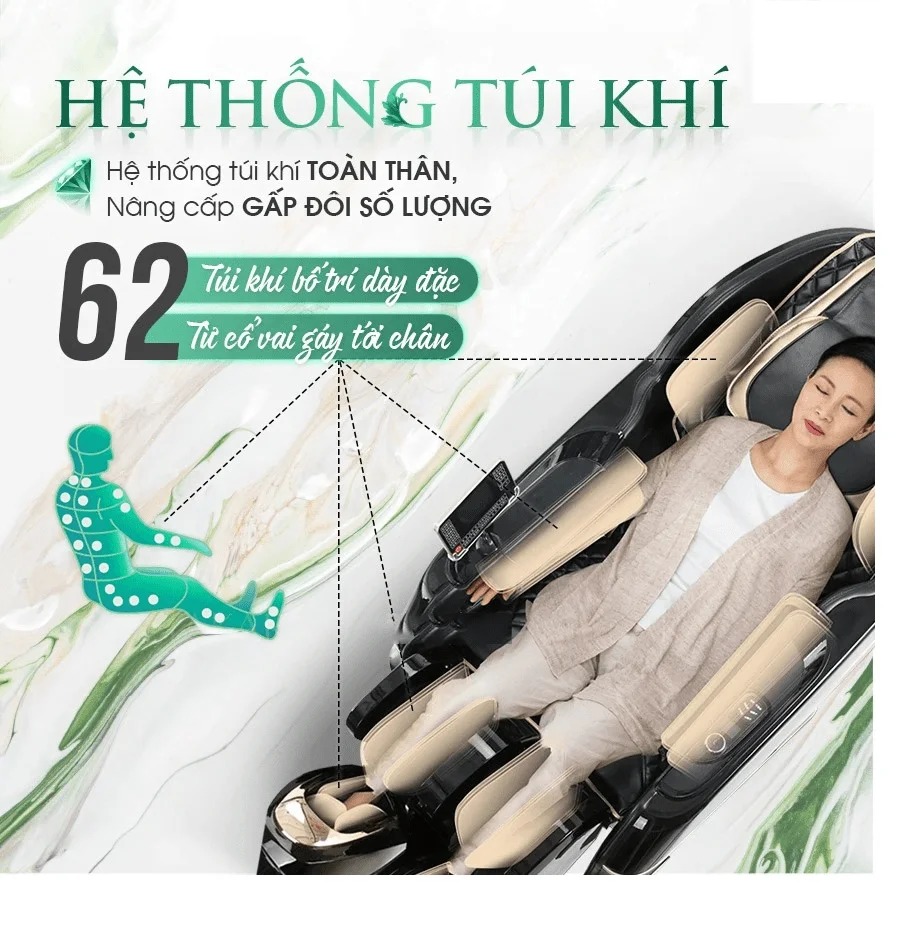 Hệ thống túi khí được bố trí trải dài khắp cơ thể, từ vai, tay đến bắp chân, bàn chân. Các chế độ massage đa dạng cho phép điều chỉnh lực bóp, giúp nâng cao hiệu quả xoa bóp, hỗ trợ lưu thông máu, giảm căng cứng cơ.