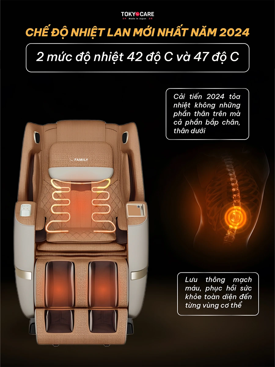 FC-555 cải tiến vượt trội so với các model cũ chỉ tập trung làm ấm và tản nhiệt phần trên cơ thể. Với chế độ nhiệt thông minh ở hai mức 42°C và 47°C cùng công nghệ tản nhiệt mới, FC-555 tùy chỉnh nhiệt độ phù hợp, sau đó làm ấm đều các vùng cơ thể, tạo cảm giác dễ chịu, kích thích lưu thông máu và giảm đau cho cơ bị căng cứng. Ghế còn khắc phục tình trạng "lạnh cơ-khô khớp" không chỉ ở vai, lưng, eo mà còn mở rộng đến cả phần dưới cơ thể, giúp điều hòa tuần hoàn máu và cải thiện sức khỏe toàn diện từ trên xuống dưới.