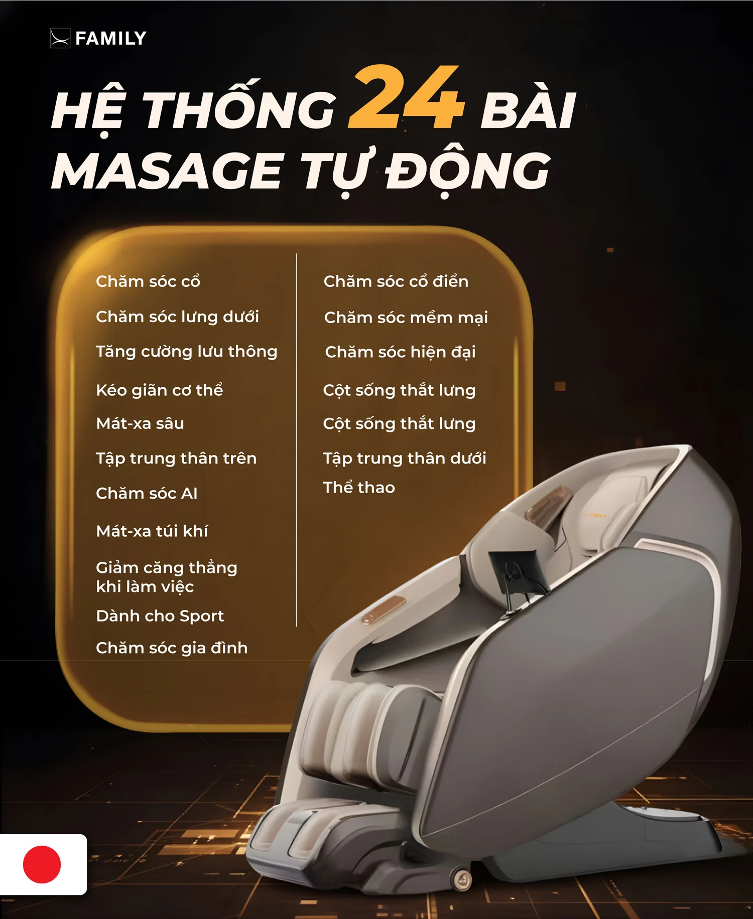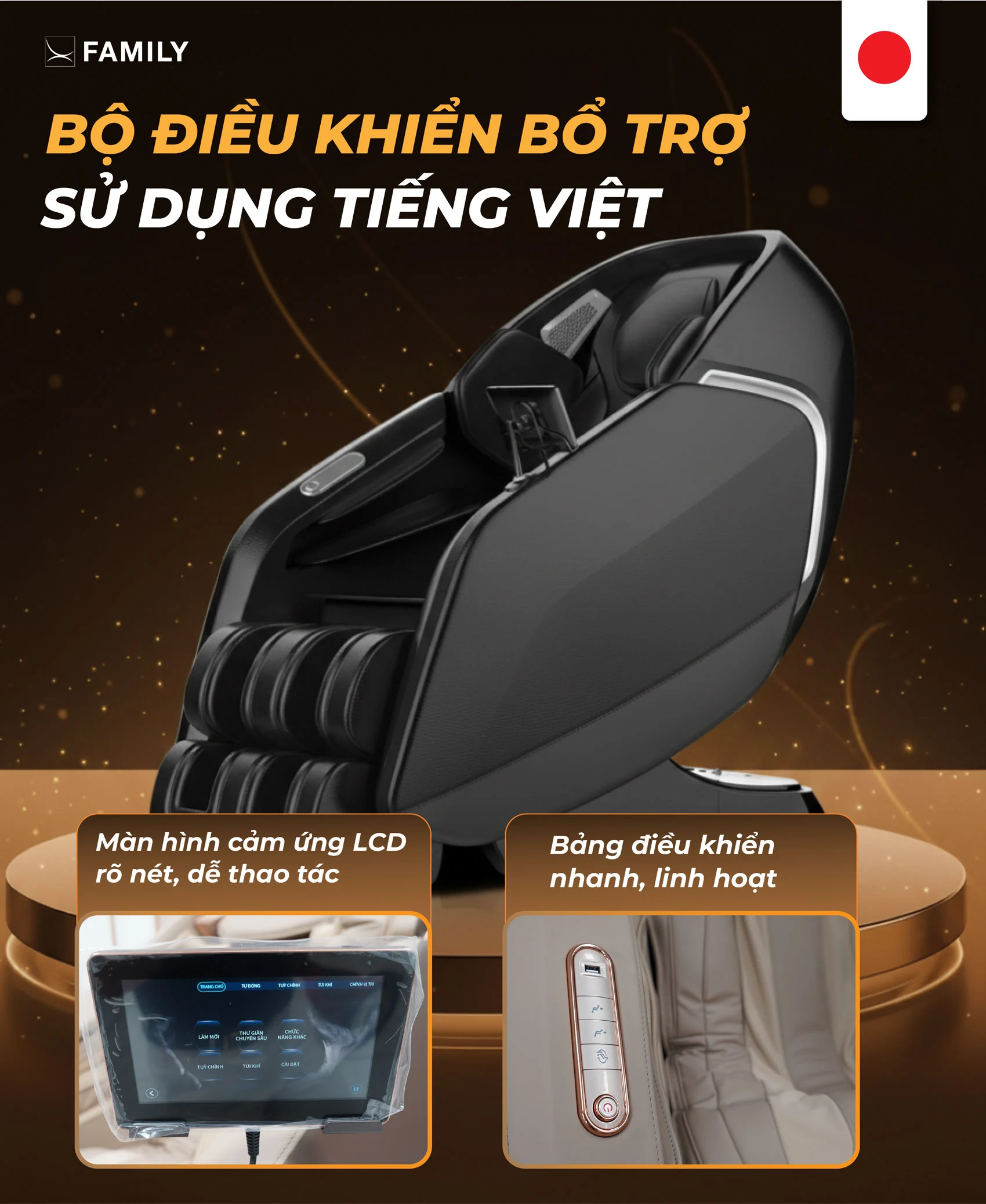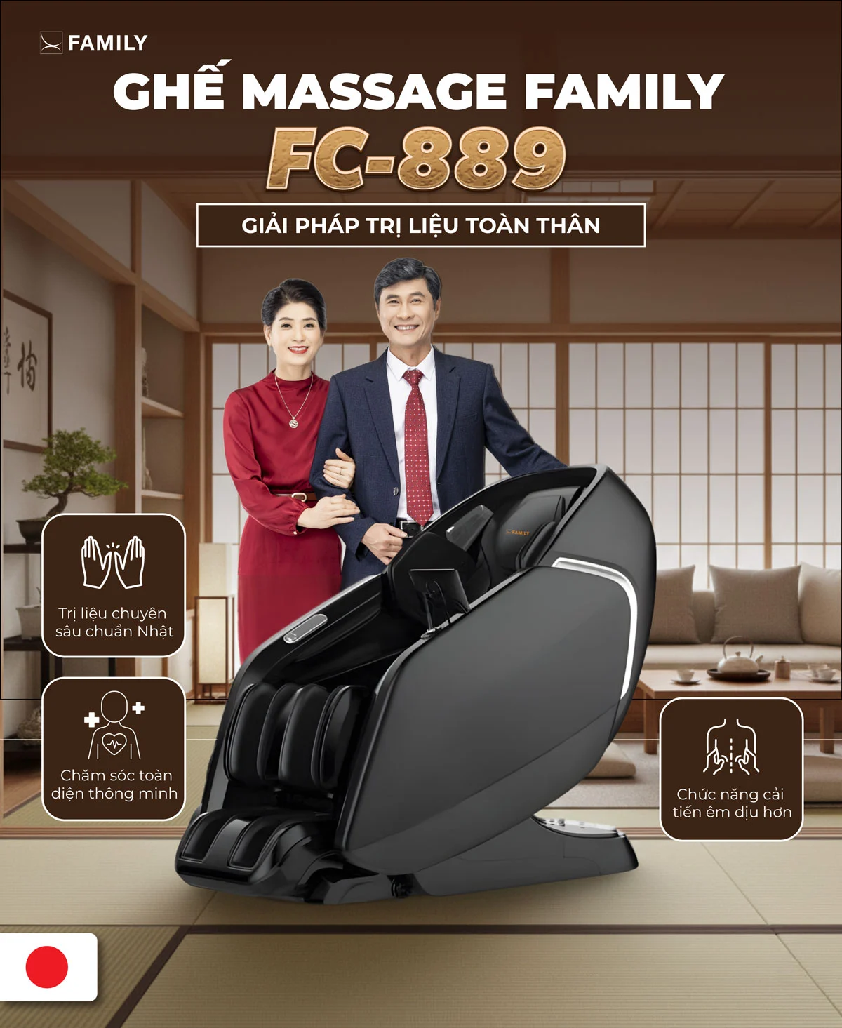 Ghế massage toàn thân FAMILY FC-889 đánh dấu cột mốc mới của công nghệ chăm sóc sức khỏe tại gia, nơi công nghệ trị liệu toàn thân chuẩn Nhật Bản được tái hiện một cách tinh xảo và mạnh mẽ. FC-889 - Lựa chọn xứng đáng để nâng tầm sức khỏe cho cả gia đình.