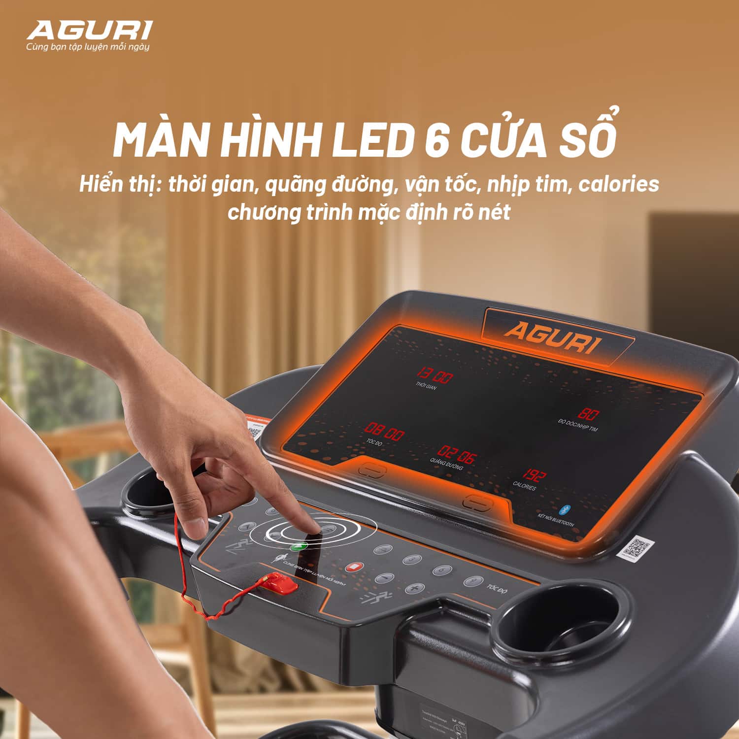 Máy chạy bộ AGT-130LE sở hữu màn hình LED gồm 6 ô hiển thị rõ ràng, trực quan và thân thiện với người dùng. Các thông số được hiển thị bao gồm: thời gian, quãng đường, tốc độ, nhịp tim, lượng calo tiêu thụ và chương trình tập luyện. Nhờ đó, người dùng dễ dàng theo dõi tình trạng cơ thể và điều chỉnh cường độ tập phù hợp.