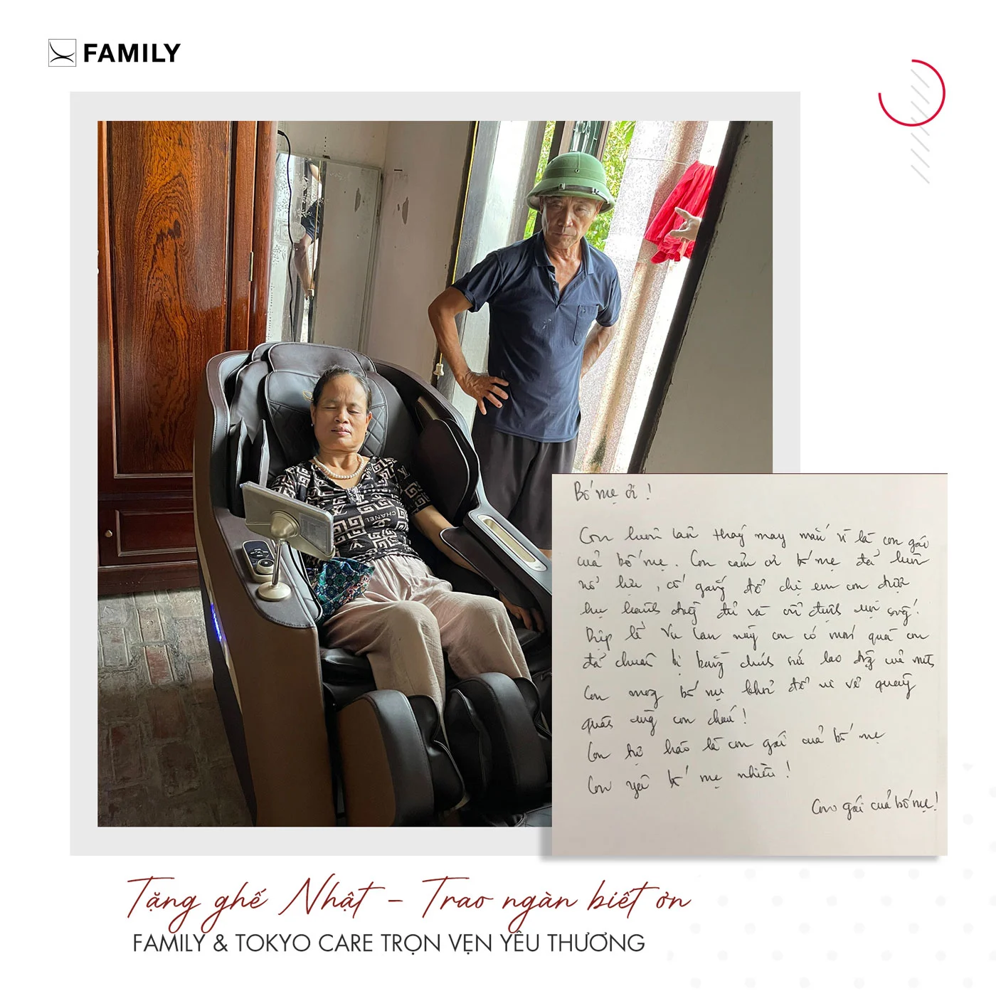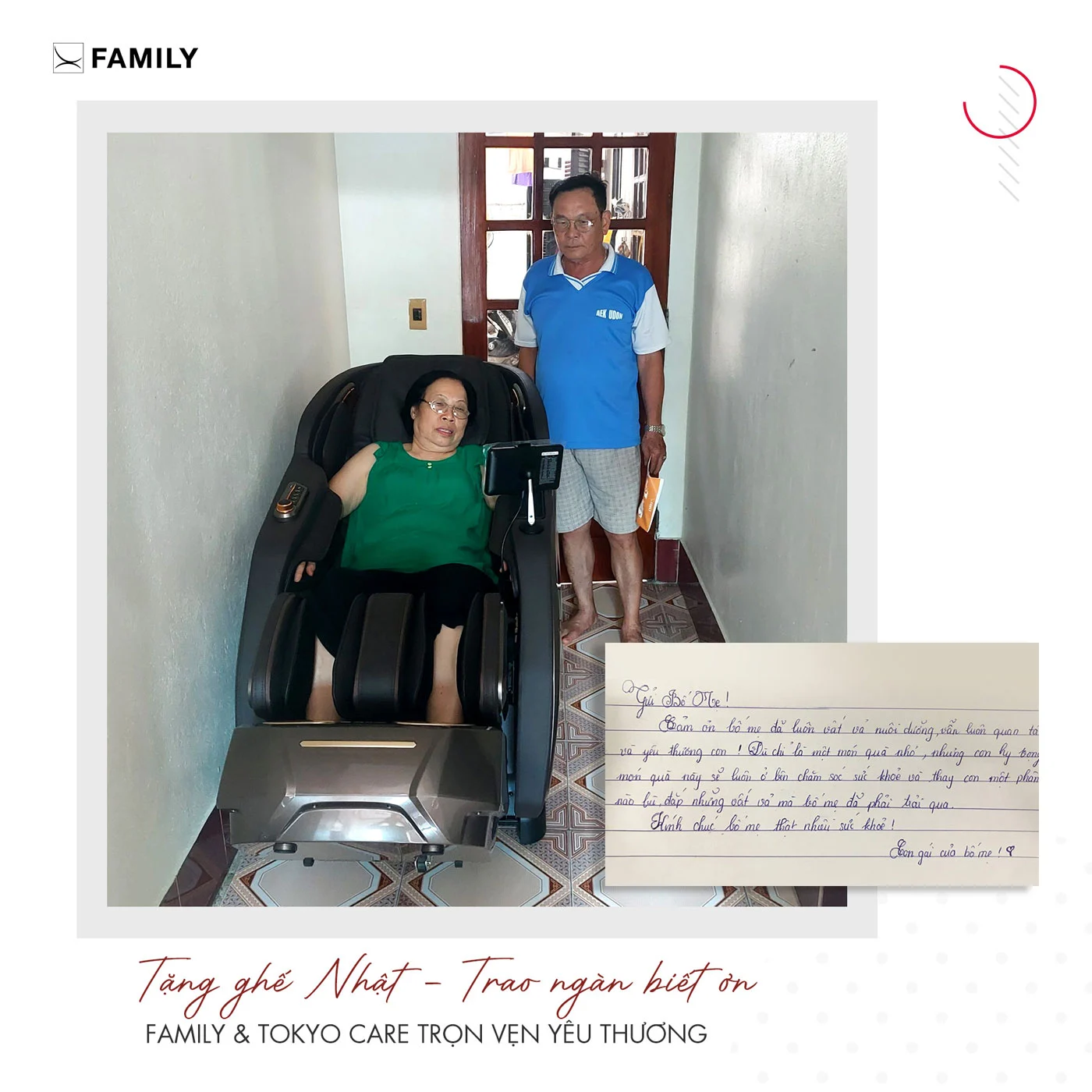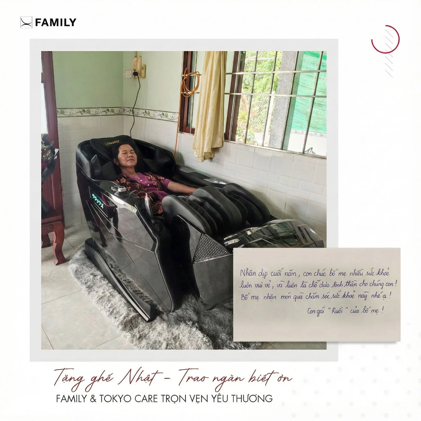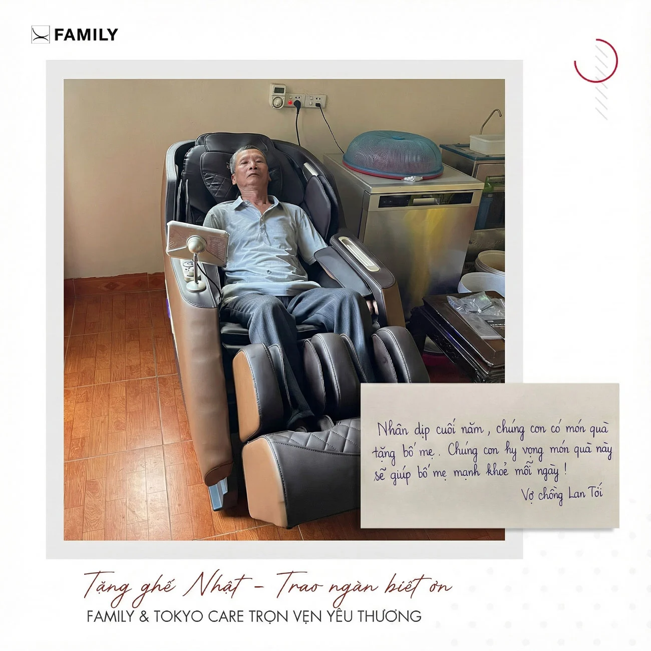 Một chiếc ghế massage phù hợp không chỉ giúp ba mẹ bớt đau nhức, ngủ ngon hơn mà còn thể hiện sự quan tâm lâu dài của con cái. Với hơn 62.000 gia đình Việt tin tưởng, Ghế Massage Family tự hào là người bạn đồng hành chăm sóc sức khỏe cho ba mẹ mỗi ngày.
