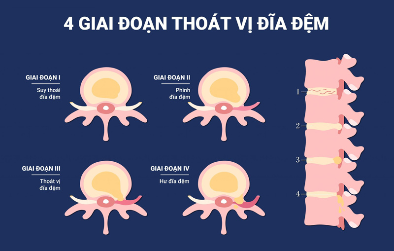 Khi đĩa đệm dần trở nên lão hoá và suy yếu, bao xơ bên ngoài có thể bị khô gãy, rách,… khiến nhân nhầy thoát ra ngoài gây ra bệnh thoát vị đĩa đệm. Bệnh thoát vị đĩa đệm biểu hiện qua 4 giai đoạn: