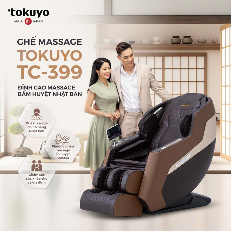 Ghế massage Tokuyo TC-399 ứng dụng công nghệ con lăn massage 3D, massage nhiệt hồng ngoại giúp xoa bóp cho người thoát vị đĩa đệm. Tính năng không trọng lực có thể ngả tựa lưng để người dùng có thể nghỉ ngơi hoặc thư giãn một cách thoải mái. Ngoài ra, mẫu ghế này đi kèm với một bộ điều khiển từ xa, cho phép người sử dụng tùy chỉnh các chế độ mát-xa, vùng mát-xa và thời gian sử dụng.