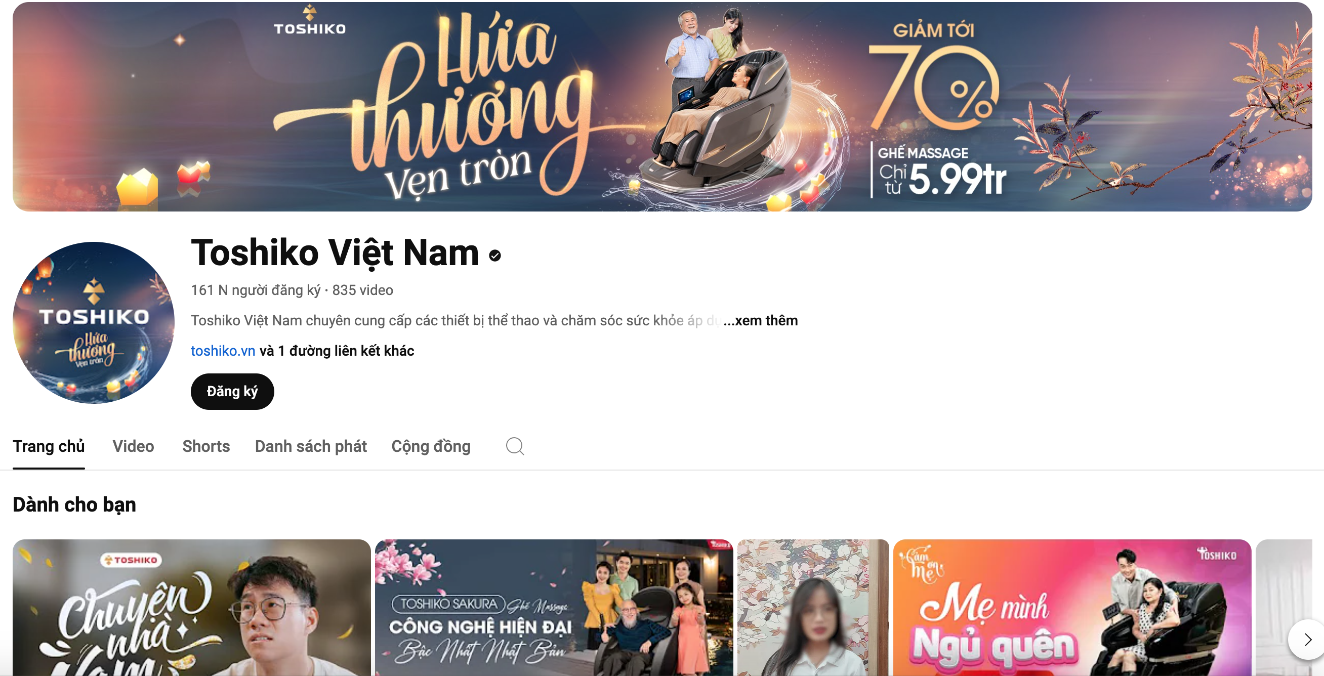 Kênh YouTube của ghế massage Toshiko thu hút 161 nghìn người đăng ký với 835 video sắc nét, cung cấp thông tin chi tiết về các dòng sản phẩm của hãng.