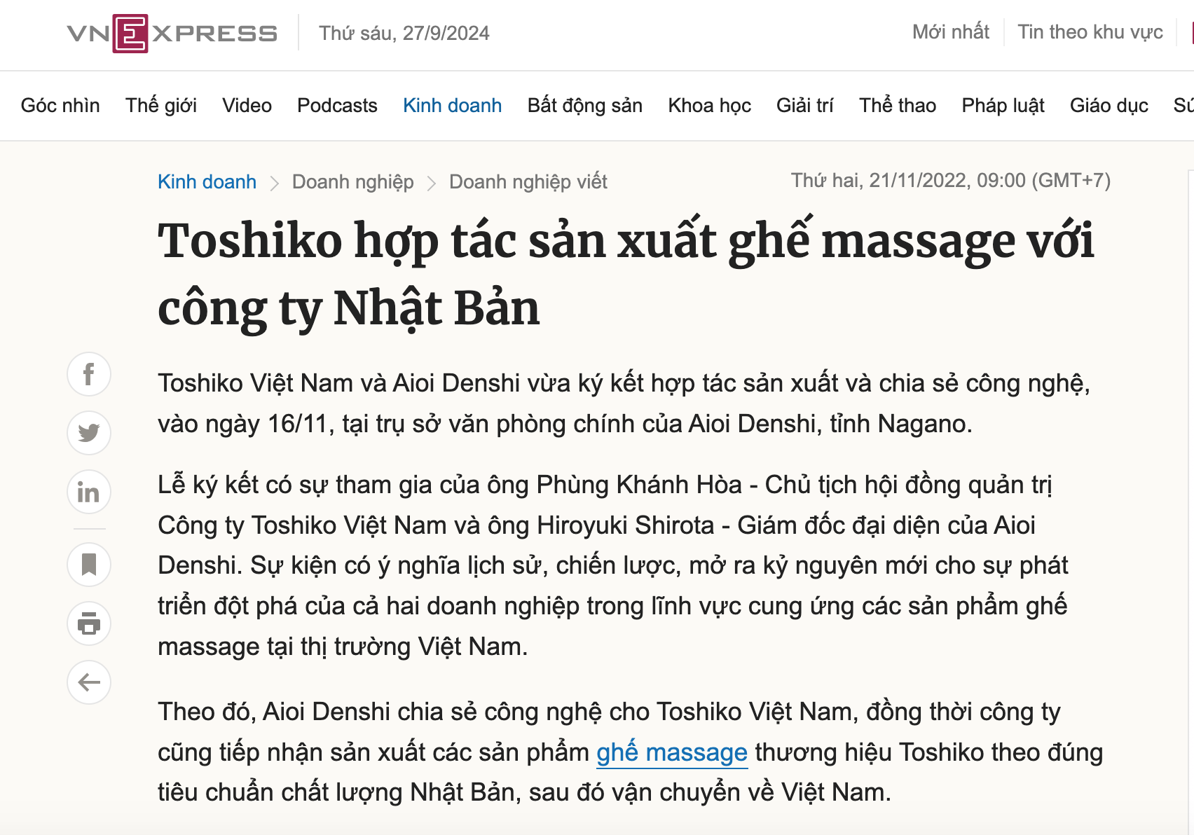 Ghế massage Toshiko nhận được nhiều sự chú ý từ nhiều tờ báo điện tử uy tín, nhận được những lời khen ngợi về thương hiệu, chất lượng sản phẩm và dịch vụ.